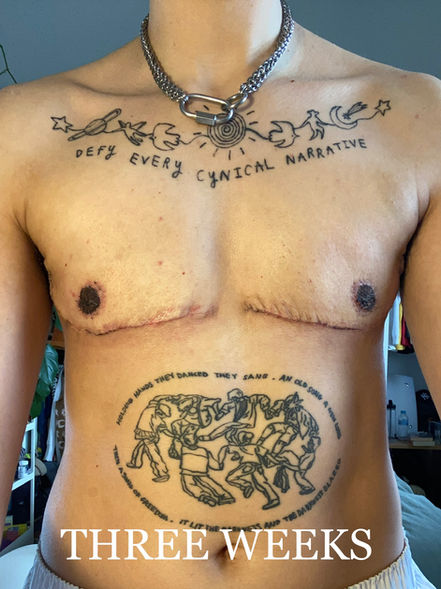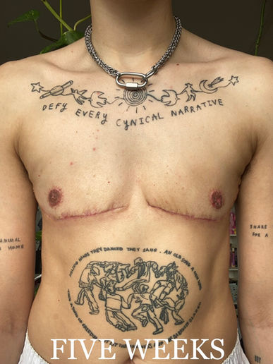 He also explained in a lot of detail exactly how the nipples are created because I enquired about why some people have that "perfect" masc nipple with the little blob in the middle but most don’t and are flat -- he explained it's determined by the nipple you have & because AFAB nipples are inherently different from AMAB ones, if you have tiny nipples you're more likely to achieve the little blob but otherwise it can be more difficult to get that. This really helped me to understand & better accept that I am unlikely to have the "perfect" nipples I have in my head (which is a fallacy anyway because if watching Love Island has taught me anything it's that AMAB nipples are just as varied as AFAB ones!).